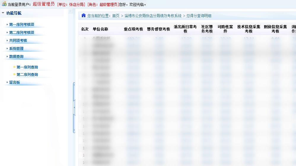 考核系統(tǒng)緊緊圍繞公安機關(guān)的工作重心,通過公開、公平、公正的網(wǎng)上考核,科學(xué)、客觀、全面、直觀反映公安機關(guān)每個單位的工作實績,彰顯先進,督促落后,持久地保持公安工作和公安隊伍的健康活力??己讼到y(tǒng)的具體功能有重點項考核、社區(qū)警務(wù)考核、可防性案件、110接處警工作、派出所日常工作考核、警務(wù)督察考核、信息宣傳考核、信訪投訴考核等等。系統(tǒng)還提供了詳細(xì)的數(shù)據(jù)分析功能,能夠直觀的展示出各單位或各民警的考核情況。